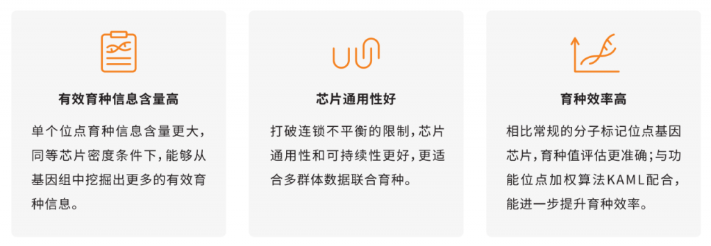 由于動物基因組中不同位點攜帶的有效育種信息含量是不同的,芯片位點設計好壞直接決定了基因組中育種信息的挖掘效率,理論上講,芯片位點越多、單個位點攜帶的有效育種信息量越大,芯片能夠挖掘的有效育種信息量就越多。常規的分子標記位點基因芯片,每個位點攜帶的有效育種信息量很少,主要來自與之相連鎖的功能突變位點。而且,連鎖程度在不同群體、不同世代會發生變化,導致分子標記位點效應不穩定,進而影響了分子標記位點基因芯片的通用性、可持續性,會降低育種效率。而功能位點基因芯片,在設計時利用了功能基因組研究最新成果,選取直接調控基因表達、蛋白質活性的功能突變,每個位點攜帶的有效育種信息含量更高,且位點效應不依賴連鎖,在不同群體、不同世代中效應穩定、通用性和可持續更好,育種效率更高是全新一代基因組育種芯片。同時,配合全新的功能位點加權算法KAML,能夠更高效利用基因組、表型組和系譜等信息,進一步提高育種值評估準確性和育種效率。