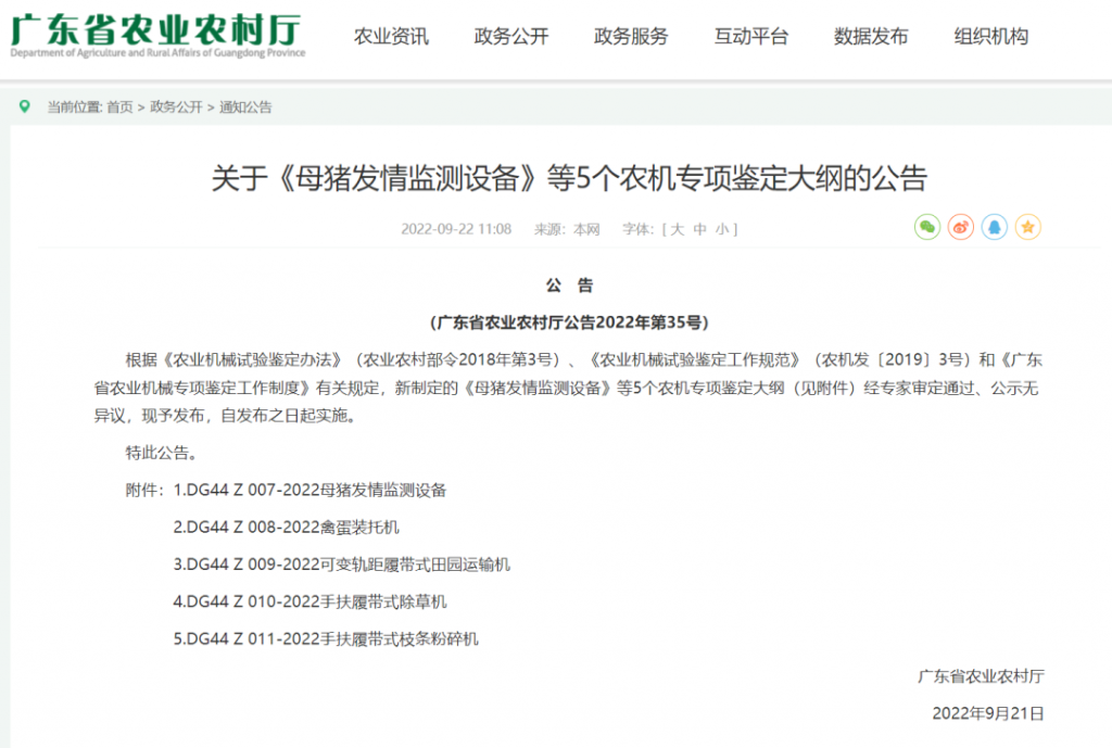 重磅!廣東省新一輪農機專項鑒定大綱出臺,影子科技參與編寫 http://m.uubook.net/15941.html http://m.uubook.net/15941.html#respond Sat, 08 Oct 2022 03:31:39 +0000 http://m.uubook.net/?p=15941 9月21日,廣東省農業農村廳發布了“關于《母豬發情監測設備》等5個農機專項鑒定大綱的公告”,其中,母豬發情監測設備專項鑒定大綱由廣東省農業技術推廣中心、數影科技(影子科技子公司)、影子科技共同起草。