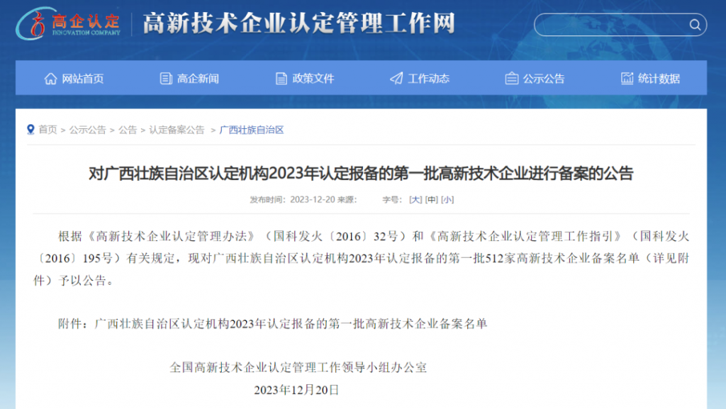12月20日,全國高新技術企業認定管理工作領導小組辦公室正式公布《廣西壯族自治區認定機構2023年認定報備的第一批高新技術企業備案名單》,秀博基因名列其中,順利通過國家高新技術企業認定,這標志著公司的科技創新能力獲得權威認可。