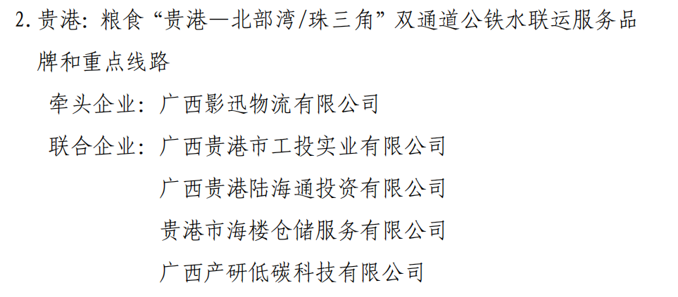 近日,廣西壯族自治區交通運輸廳、廣西壯族自治區財政廳公布第二批廣西多式聯運服務品牌和重點線路項目名單,由廣西影迅物流有限公司牽頭創建的糧食“貴港一北部灣/珠三角”雙通道公鐵水聯運服務品牌和重點線路項目榜上有名。