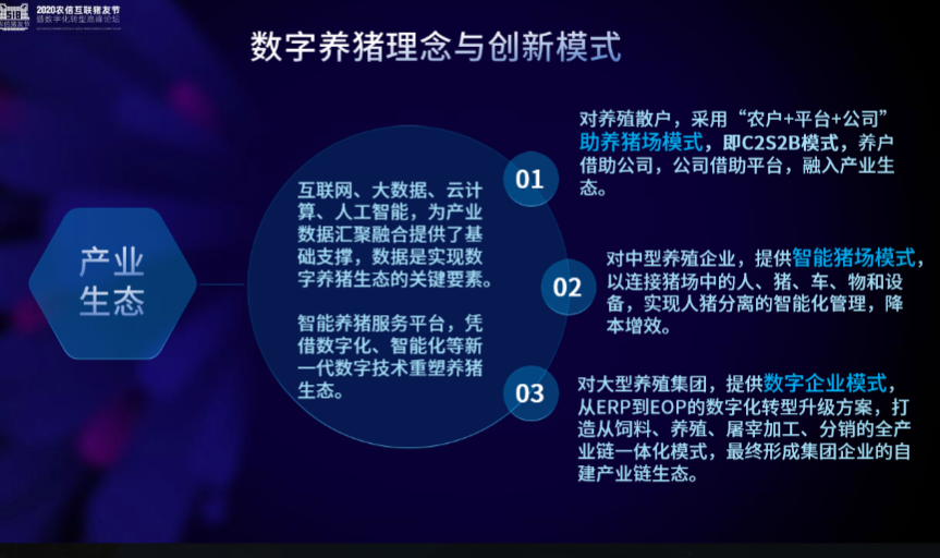 于瑩對此講解了農信互聯在數字養豬理念和創新模式上的探索:以互聯網、大數據、云計算、人工智能為基礎支撐,建立智能養豬服務平臺,對養殖散戶,采用“農戶+平臺+公司”助養豬場模式;對于中型養殖企業,提供智能豬場模式;對于大型養殖集團,提供數字企業模式。