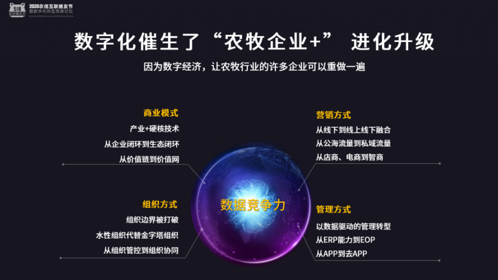 因為數字經濟,讓農牧行業的許多企業可以重做一遍,數字化催生了“農牧企業+”的進化升級,也使得商業模式、營銷方式、組織方式、管理方式發生改變。