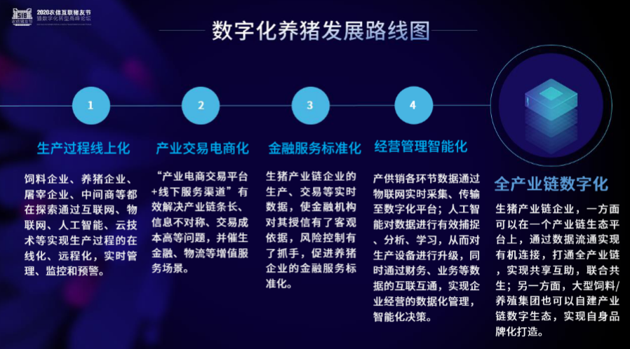 數字化轉型升級能解決什么問題?趙國棟認為它能解決五大問題:1、如何做大?數字化轉型升級使業務成規模。2、如何可控?數字化轉型升級使管理精細化、數字化。3、如何貸款?數字化轉型升級能帶來及時的金融支持。4、如何銷售?數字化轉型升級帶來更大規模的市場。5、高素質的人才如何為我所用?數字化轉型升級使更多技術實現共享,也意味著更多人才實現共享。 農牧企業如何數字化轉型升級?趙國棟認為,裝備數字化、生產單元(豬舍)數字化、經營單元(豬場)數字化、企業數字化、產業鏈數字化、跨產業數字化是數字化轉型升級的六個階段,企業首先要明白自己處于哪個階段,未來打算發展到哪個階段,從最終的結果反推到當前去選擇自己需要的工具或者伙伴。 農牧企業數字化轉型如何選擇工具或伙伴?趙國棟認為可以將其分解為三個問題去思考:第一,選工具還是選合作伙伴?選擇志同道合、價值觀一致的合作伙伴才有好的開始。第二,選更懂農牧的還是選更懂技術的?懂農牧的人或許能提供更實際、更直接、更簡單的方案。第三,選有一技之長的還是選能提供更多方案的?當前行業變化日新月異,可能你今天只是需要簡化工作流程,明天就需要有效的防控方案,后天就需要金融服務,所以選擇能提供更多方案的是上策。 農信互聯副總裁、研究院院長于瑩帶來《危機下重建的機會——2020中國養豬產業數字化發展報告》。于瑩指出,隨著科技的創新和消費側帶動,數字化正滲透到我們生產、生活的方方面面,現如今,農牧食品行業也亟需數字化升級以打通產業鏈。