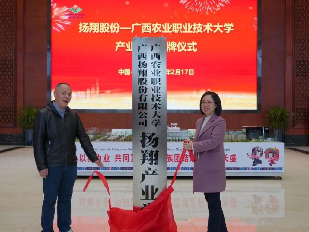 為推動(dòng)產(chǎn)教融合,深化校企合作,謀求互利共贏發(fā)展,2月17日下午,揚(yáng)翔股份與廣西農(nóng)業(yè)職業(yè)技術(shù)大學(xué)進(jìn)行校企合作交流洽談,并舉行了產(chǎn)業(yè)學(xué)院合作簽約揭牌儀式。